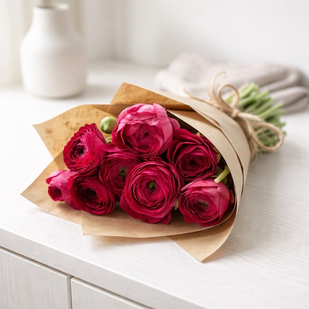- Romantische Sträuße: Kombinieren Sie die Ranunkeln Pink mit weißen Tulpen, Schleierkraut oder Eukalyptus für ein harmonisches Arrangement.