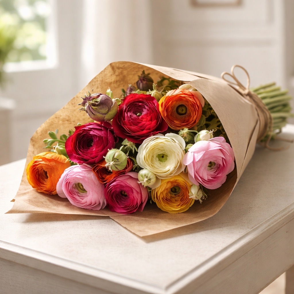 - Lebendige Sträuße: Kombinieren Sie die gemischten Ranunkeln mit Schleierkraut, Lavendel oder Eukalyptus für ein harmonisches Arrangement.