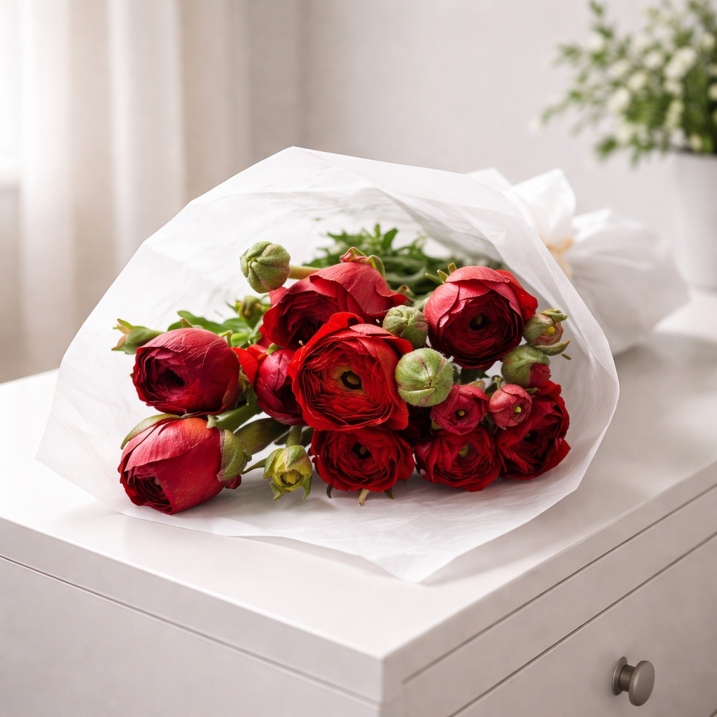 - Romantische Sträuße: Kombinieren Sie die Ranunkeln Rot mit weißen Rosen, Schleierkraut oder Eukalyptus für ein harmonisches Arrangement.