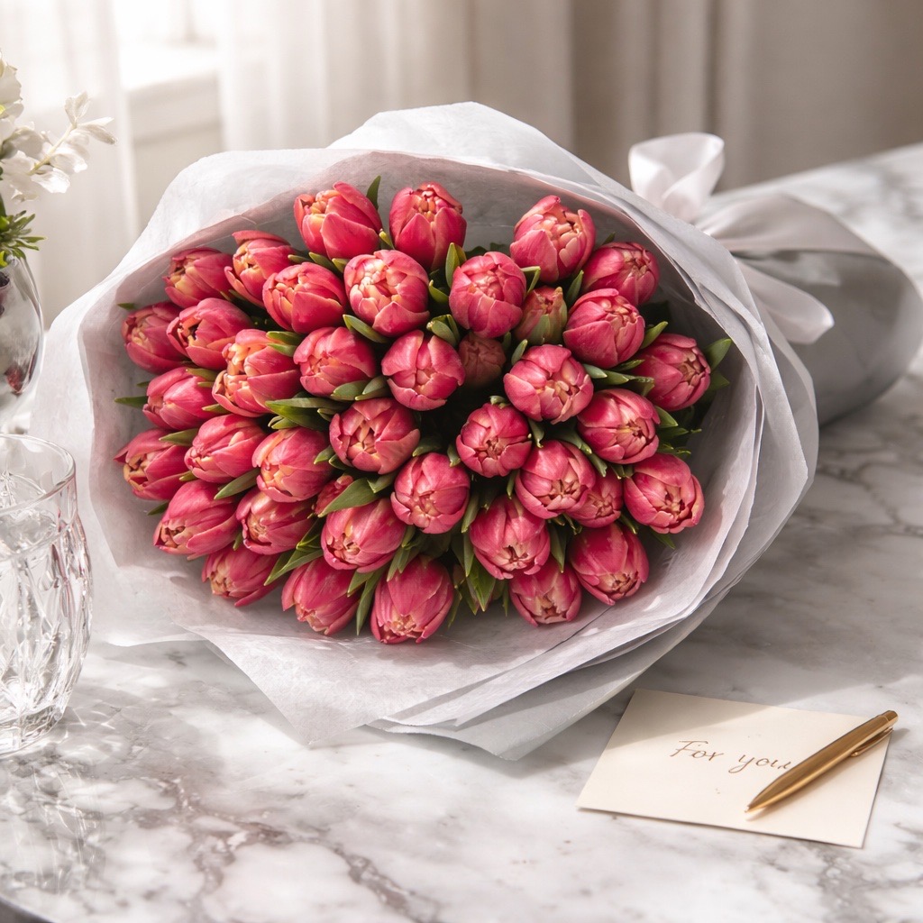 Die Tulpen Columbus beeindrucken mit ihren gefüllten, luxuriösen Blüten, die in einer harmonischen Kombination aus zartem Rosa und reinem Weiß erstrahlen. Ihre doppelte Blütenpracht verleiht jedem Arrangement eine außergewöhnliche Eleganz und Fülle. Diese besonderen Tulpen sind ideal für opulente Sträuße, romantische Tischdekorationen oder als auffällige Akzente in kreativen Blumenkreationen.