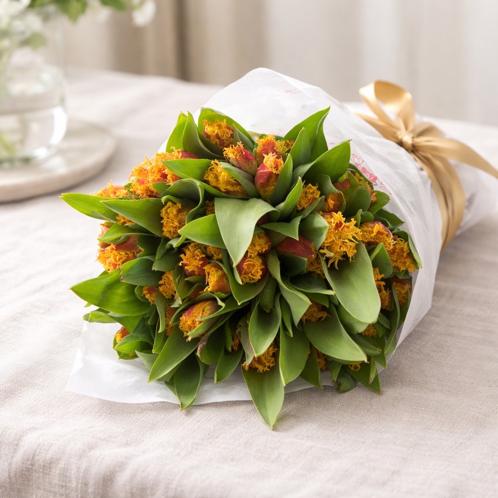 Die Tulpen Davenport beeindrucken mit ihrer leuchtenden Farbgebung in Gelb-Orange und den kunstvoll gefransten Blütenrändern, die jedem Arrangement eine einzigartige und lebendige Ausstrahlung verleihen. Diese außergewöhnlichen Tulpen sind ideal für frühlingshafte Sträuße, fröhliche Tischdekorationen oder als auffälliger Akzent in kreativen Blumenkreationen. Ihre warme Farbpalette bringt Frische und Energie in jede Dekoration.