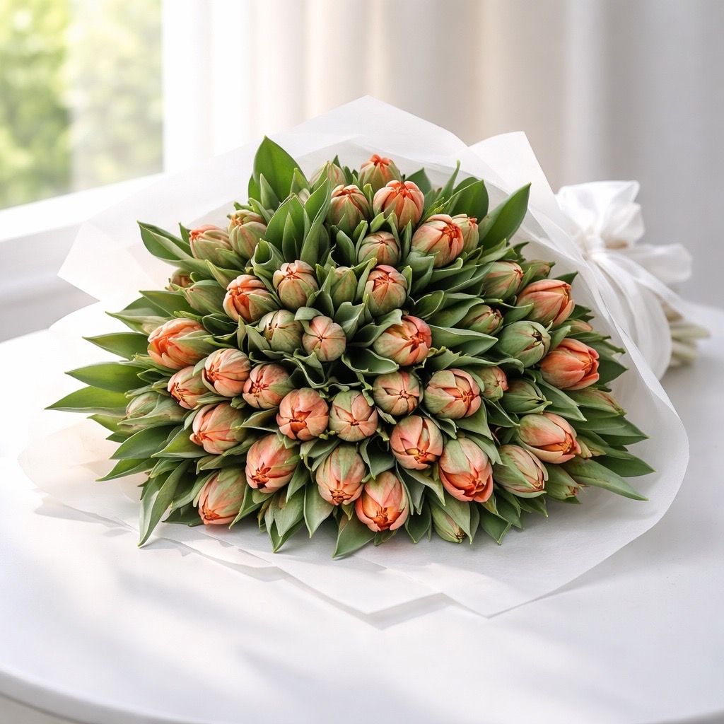 Die Tulpen Orange Princess (Gefüllt) sind ein echter Blickfang mit ihren luxuriösen, gefüllten Blüten in leuchtendem Orange, akzentuiert durch subtile violette Nuancen. Diese Tulpen verleihen jedem Arrangement eine außergewöhnliche Fülle und eine warme, lebendige Ausstrahlung. Ideal für opulente Sträuße, elegante Tischdekorationen oder als extravagante Akzente in kreativen Blumenkreationen.