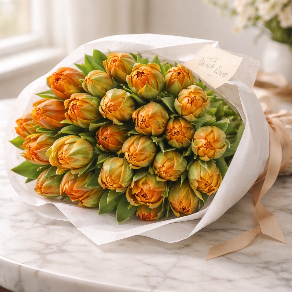 - Opulente Sträuße: Kombinieren Sie die Tulpen Orange Princess mit Schleierkraut oder dunklen Rosen für ein harmonisches Arrangement.