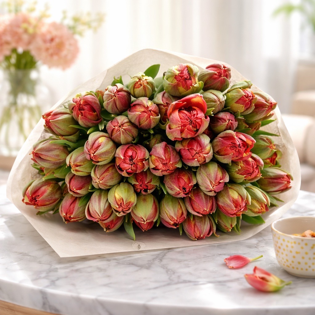 - Romantische Sträuße: Kombinieren Sie die Tulpen Red Princess mit weißem Schleierkraut oder rosa Rosen für ein harmonisches Arrangement.