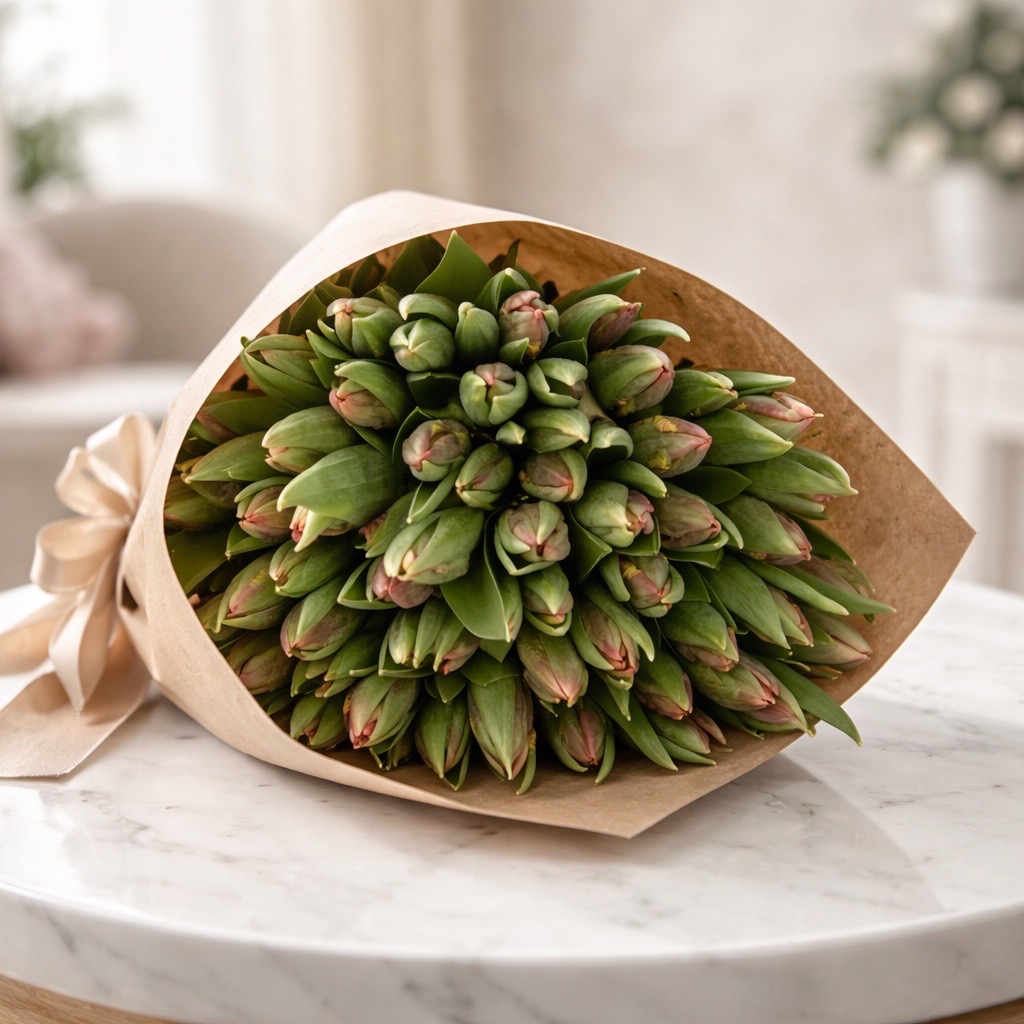 - Luxuriöse Sträuße: Kombinieren Sie die Tulpen Rococo mit Schleierkraut oder dunkelgrünem Eukalyptus für ein harmonisches Arrangement.