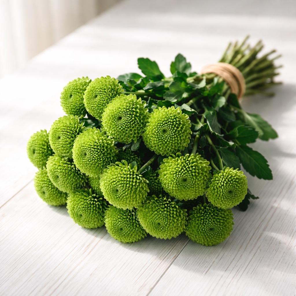 Die Santini Country Chrysanthemen überzeugen mit ihrer lebhaft grünen, kugelförmigen Blütenform, die jedem Arrangement eine natürliche und frische Note verleiht. Ihre auffällige Farbe sorgt für einen modernen und gleichzeitig harmonischen Look, ideal für zeitgemäße Dekorationen oder als Akzent in rustikalen Arrangements.