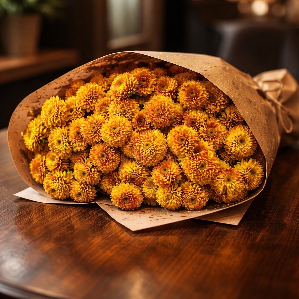 Die Santini Doria Orange Chrysanthemen bestechen mit ihren warmen, rost-orangefarbenen Blüten, die eine gemütliche und einladende Atmosphäre schaffen. Die kleinen, kugelförmigen Blüten eignen sich hervorragend für herbstliche Arrangements oder als rustikaler Akzent in modernen Dekorationen.