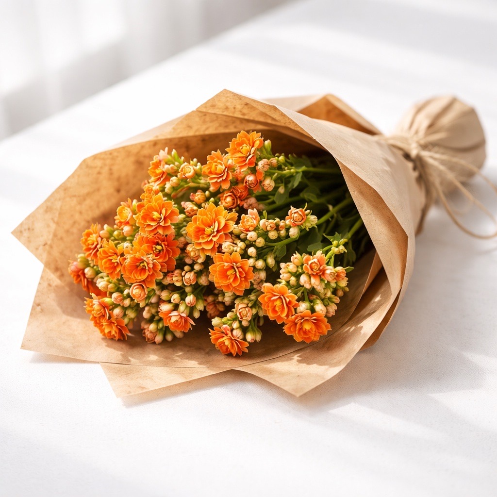 - Kompakte Sträuße: Kombinieren Sie die Kalanchoe 'Smooth Orange Meadow' mit Schleierkraut, Lavendel oder kleineren Rosen.