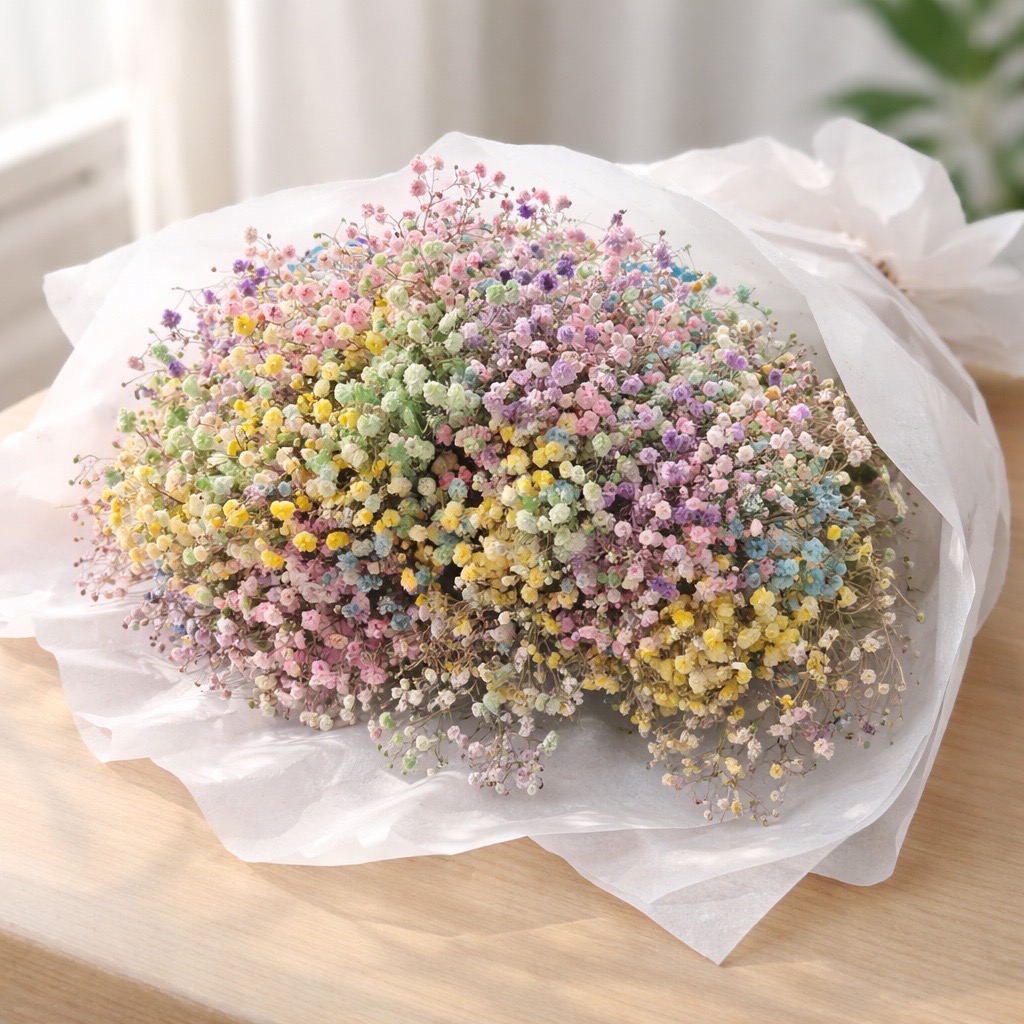 - Fröhliche Sträuße: Kombinieren Sie das Schleierkraut Rainbow mit weißen Rosen oder Eukalyptus für ein kontrastreiches Arrangement.